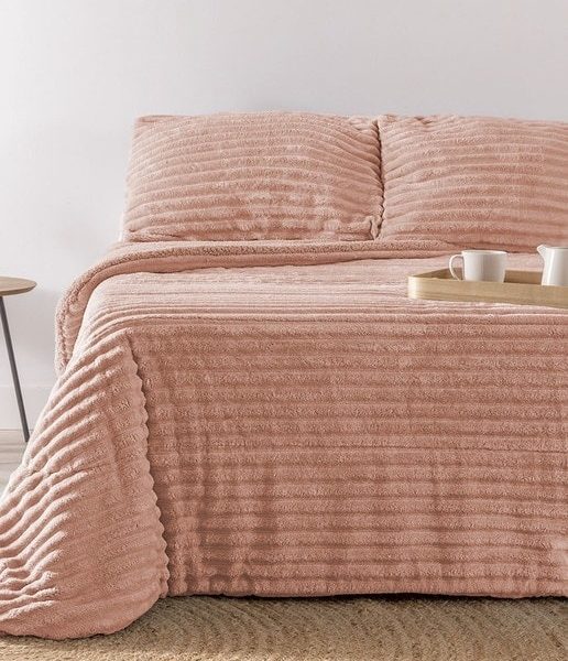Edredón acolchado jacquard sherpa modelo Larges Stripes con en colores rosa y agua marina disponible en 105, 135, 150 cm.
