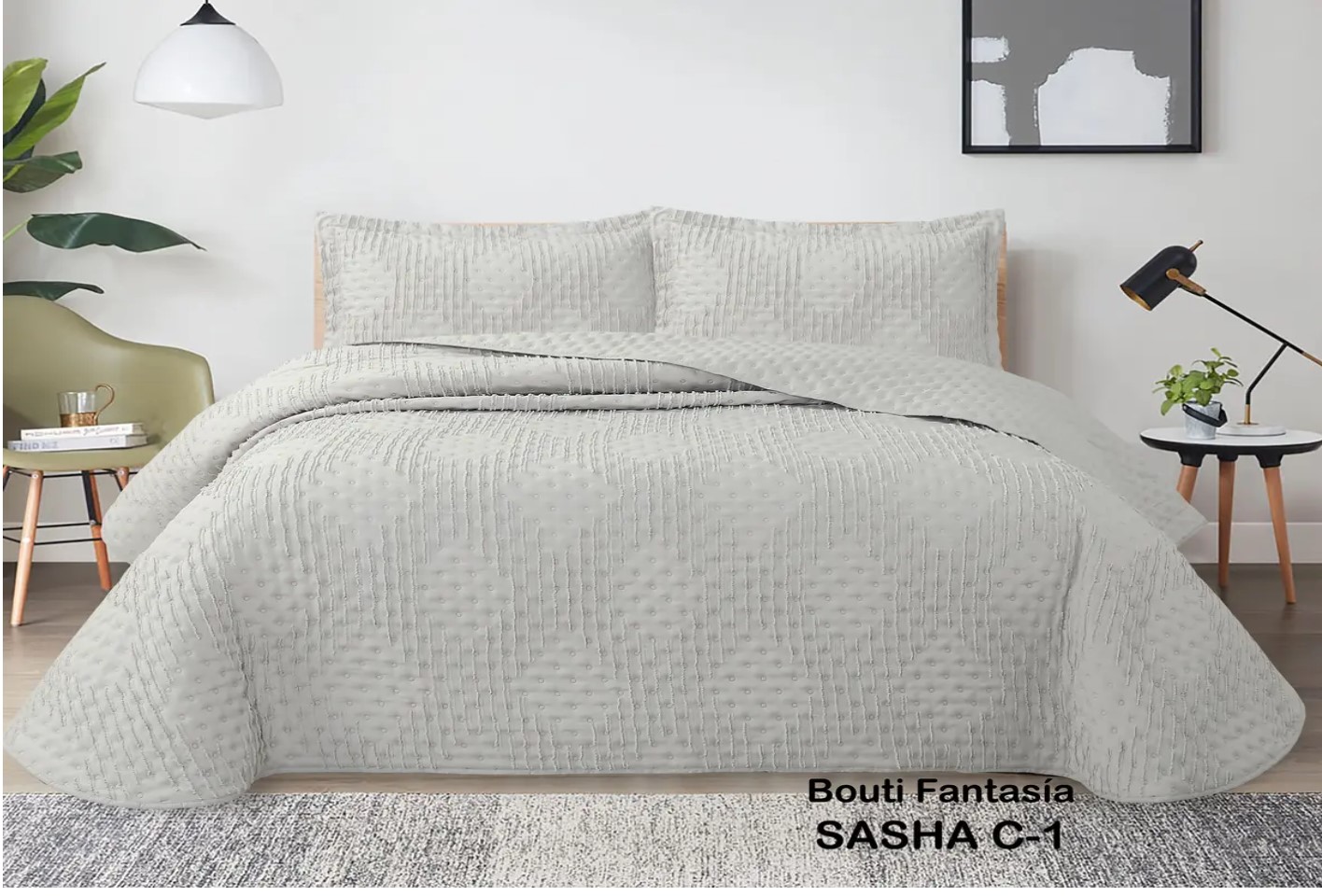 Colcha bouti jacquard confeccionada en un acolchado fino termosellado de 120 gr. De diseño estampado en color blanco y beige con relieve de rombos.