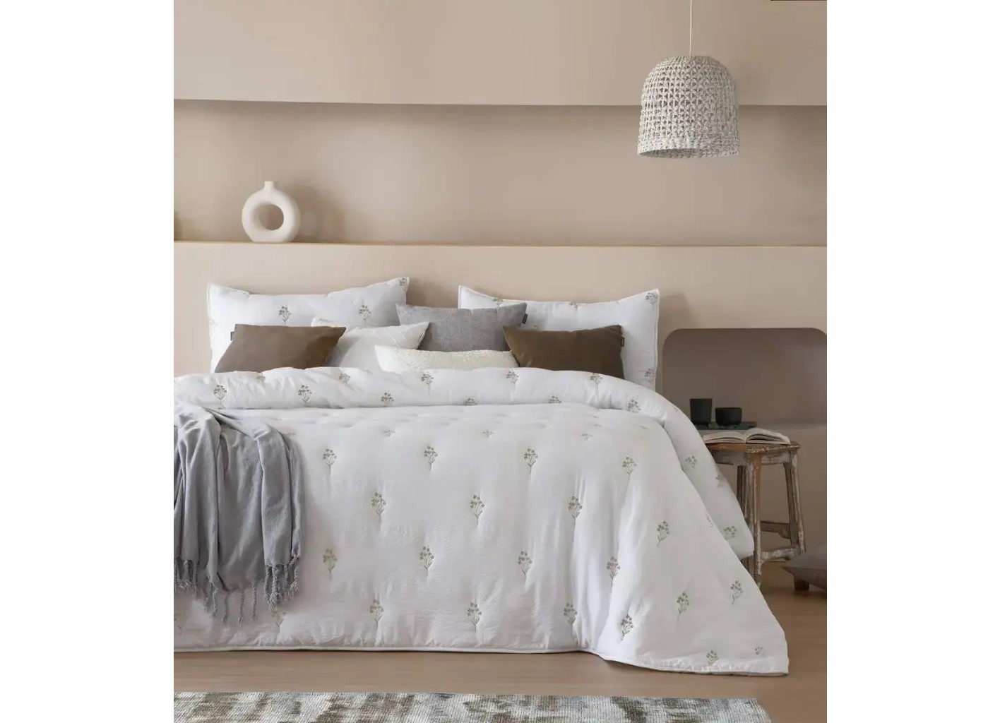 Destaca por su diseño en tono blanco con delicados bordados florales con tejido fantasía para aportar un aire sofisticado y acogedor al dormitorio.
